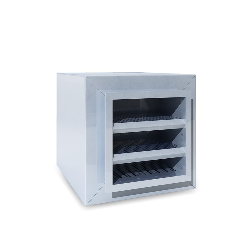 本消聲彎頭采用外角內圓結構,有利于提高消聲效果,減小阻力損失,降低再生噪音,外殼采用鋼板( 或鍍鋅板),吸聲材料為玻璃布包超細玻璃棉,并以木框或鋼框作龍骨,保證吸聲材料在高速氣流下的穩定性。